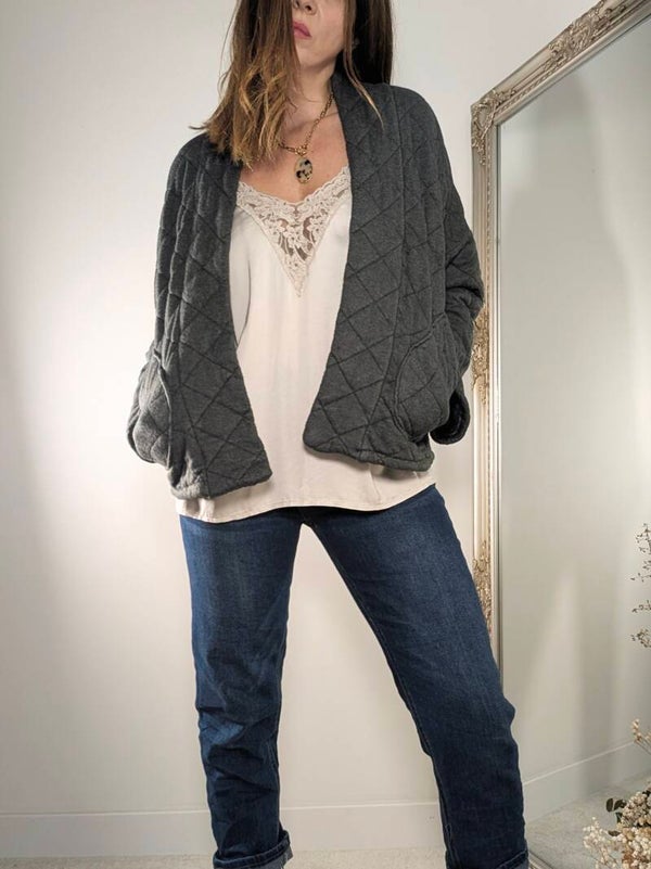 Apportez confort et élégance à votre garde-robe avec cette veste grise molletonnée. Sa texture douce et chaude en fait une pièce incontournable pour les journées fraîches. Conçue sans boutonnage, elle se porte avec aisance pour un style décontracté.