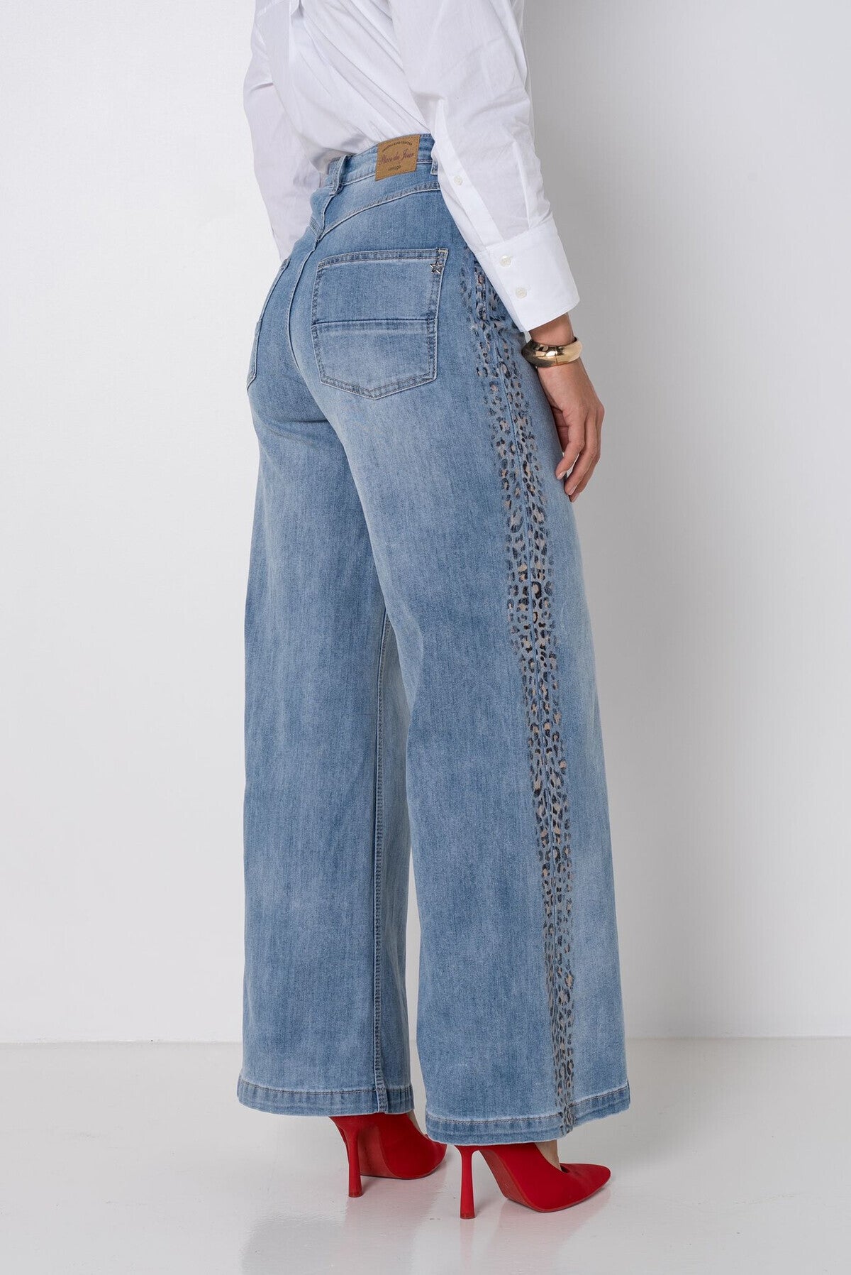 Ce jean large bleu clair associe confort et originalité avec sa bande léopard discrète sur le côté. Conçu en tissu stretch et souple, il offre une grande liberté de mouvement et une longueur de jambes généreuse pour un style tendance. Taille haute et flatteuse, il convient parfaitement aux silhouettes modernes.