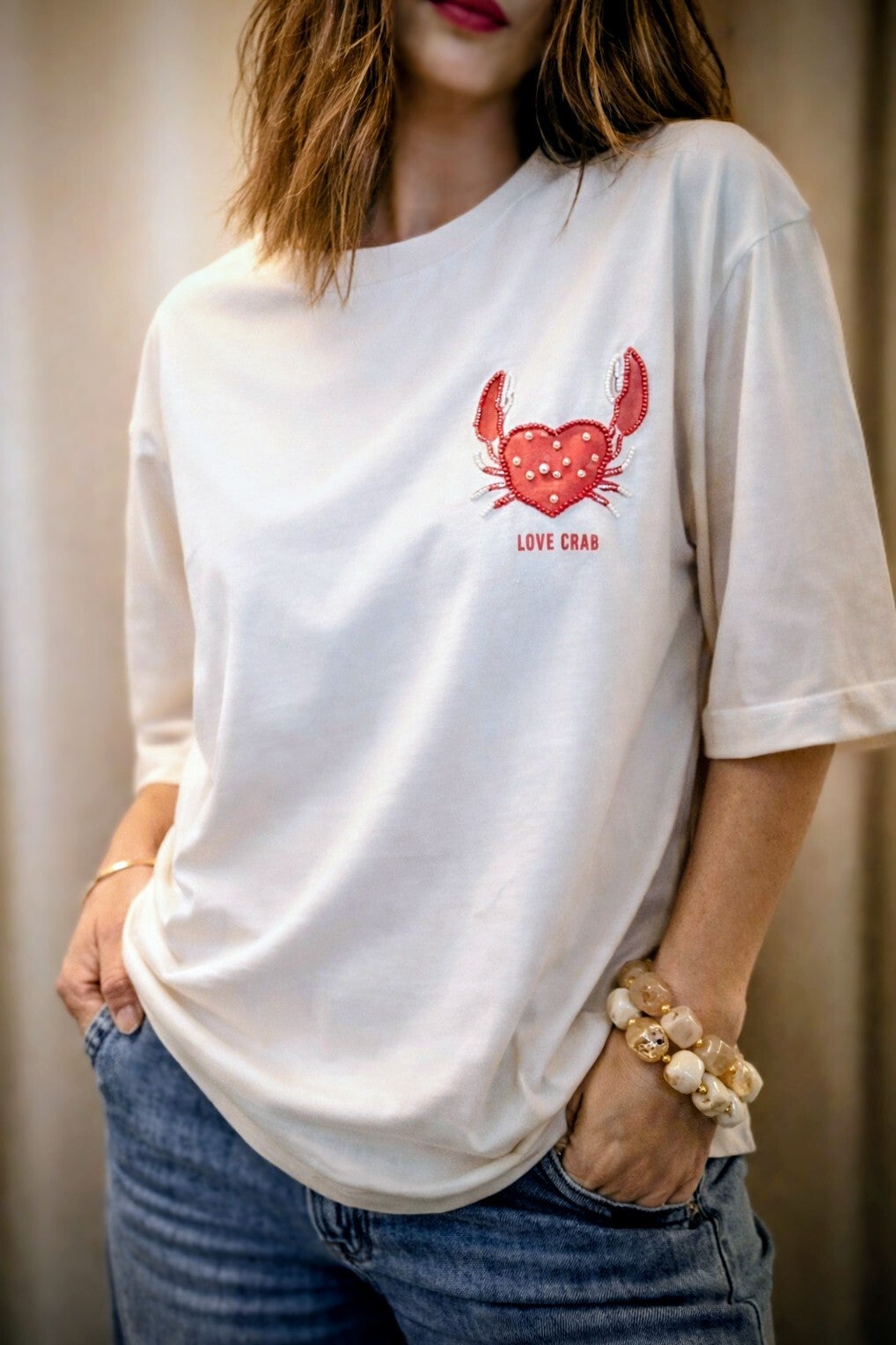 Avec son motif cœur en forme de crabe délicatement brodé et perlé, il apporte une touche originale et féminine à une tenue casual.