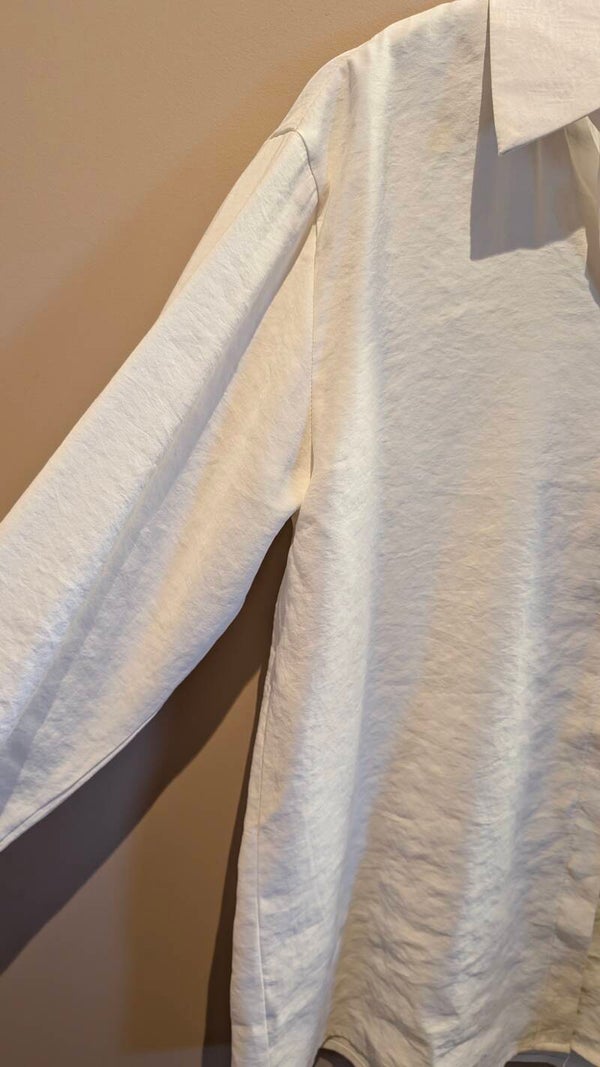 Chemisier fluide et léger, très agréable à porter avec sa coupe ample. Sa fermeture invisible sur le devant apporte une touche épurée, tandis que les boutons au dos créent un détail original et élégant.