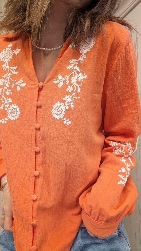 Blouse en coton léger dans un superbe orange lumineux, parfait pour la saison estivale. Ses délicates broderies apportent une touche bohème et féminine, tandis que sa coupe fluide assure un confort absolu. Une pièce solaire qui illumine instantanément une tenue.